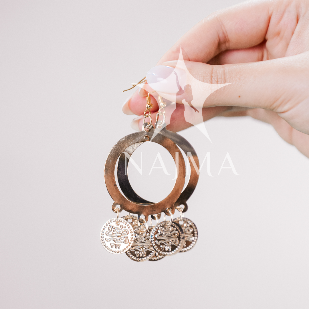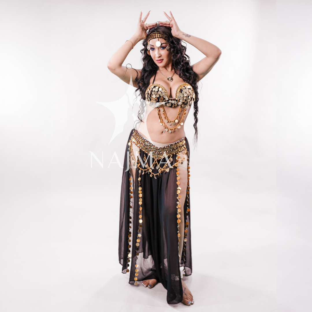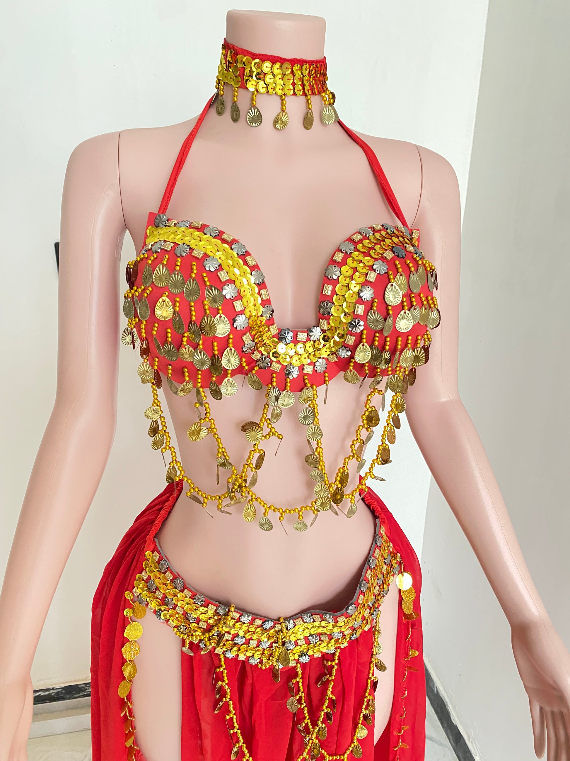 بدلة رقص مكونة من حمالة مع تنورة مملوءة بالليرات المعدنية الذهبية مع قطعة راس