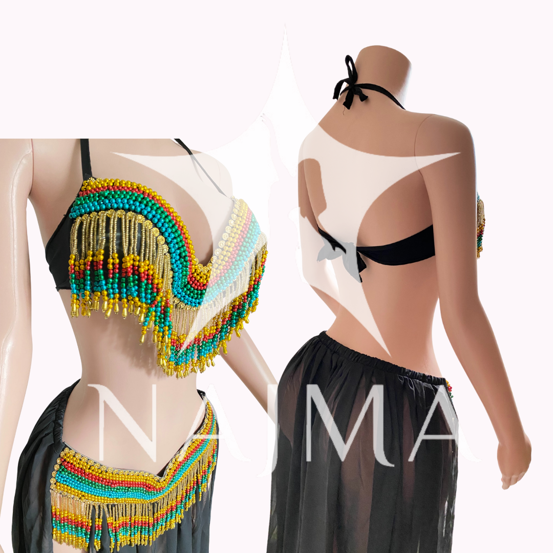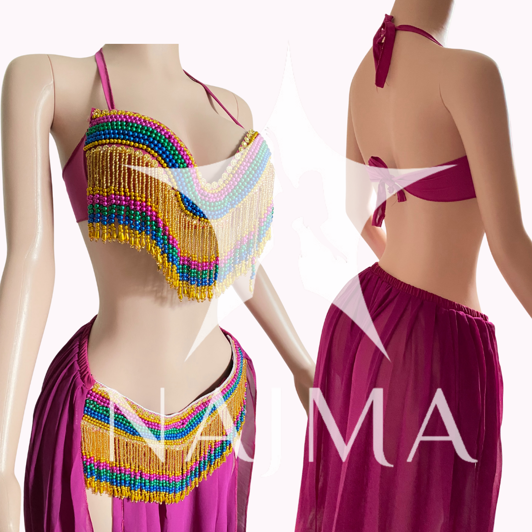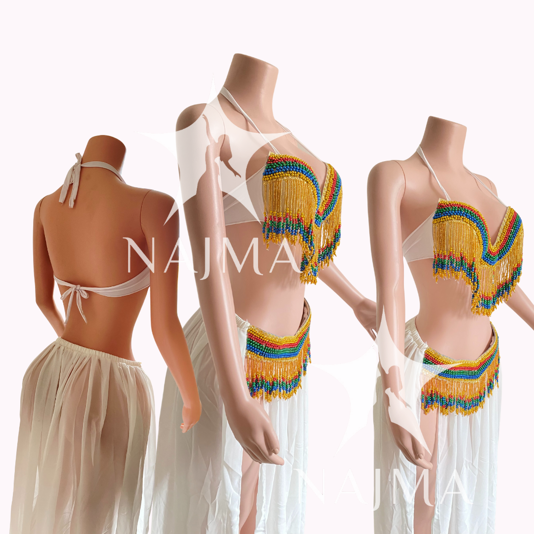 بدلة رقص بكراكيش ملونة مكونة من ثلاثة قطع مع الحمالة والتنورة صاجات ذهبية