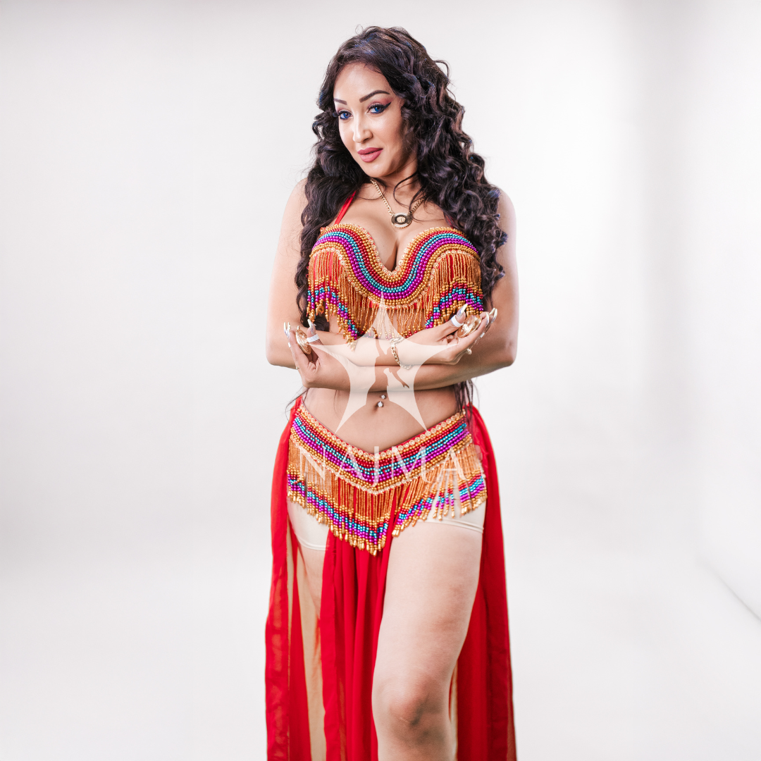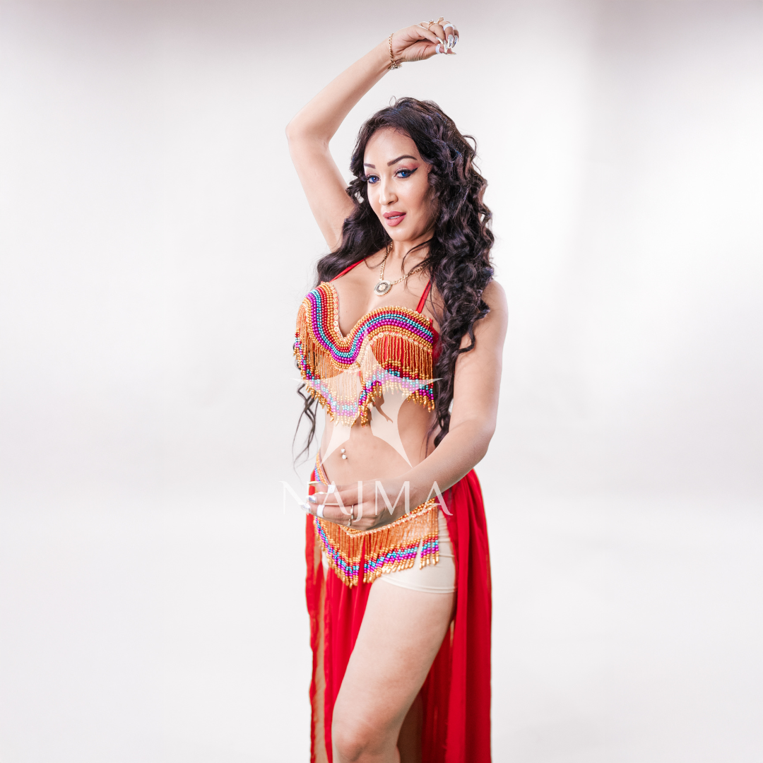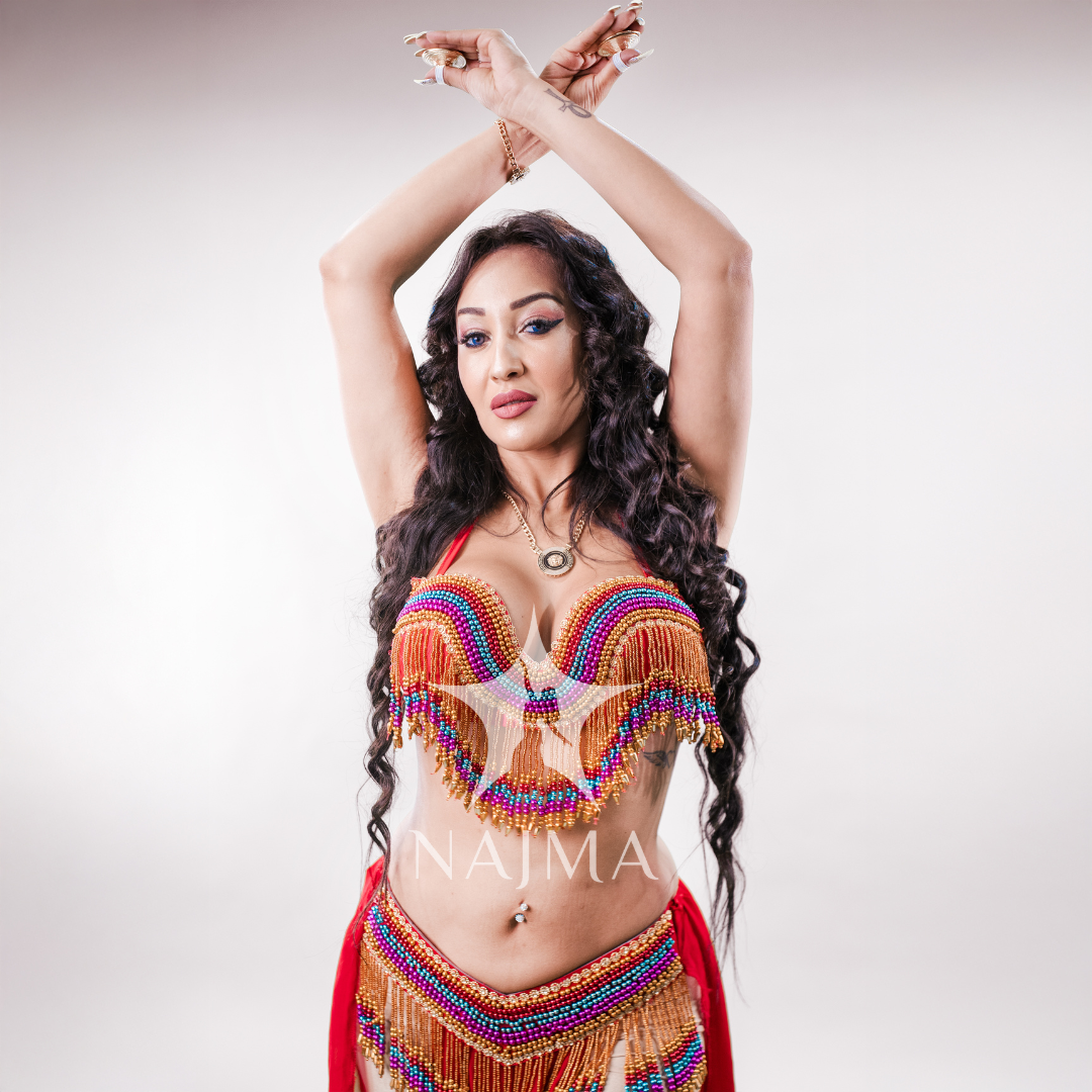 بدلة رقص بكراكيش ملونة مكونة من ثلاثة قطع مع الحمالة والتنورة صاجات ذهبية