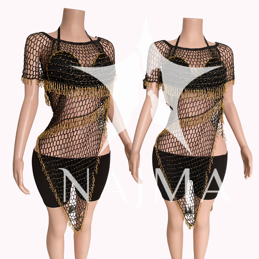 بدلة رقص ثلاثة قطع شبكة حياكة يدوية مكونة من شبكة محيوكة بجودة عالية وعمل يدوي مع حمالة سوداء وشورت اسود (الشورت يصلكِ باللون الاسود وليس البيجي كما في الصورة المعروضة)