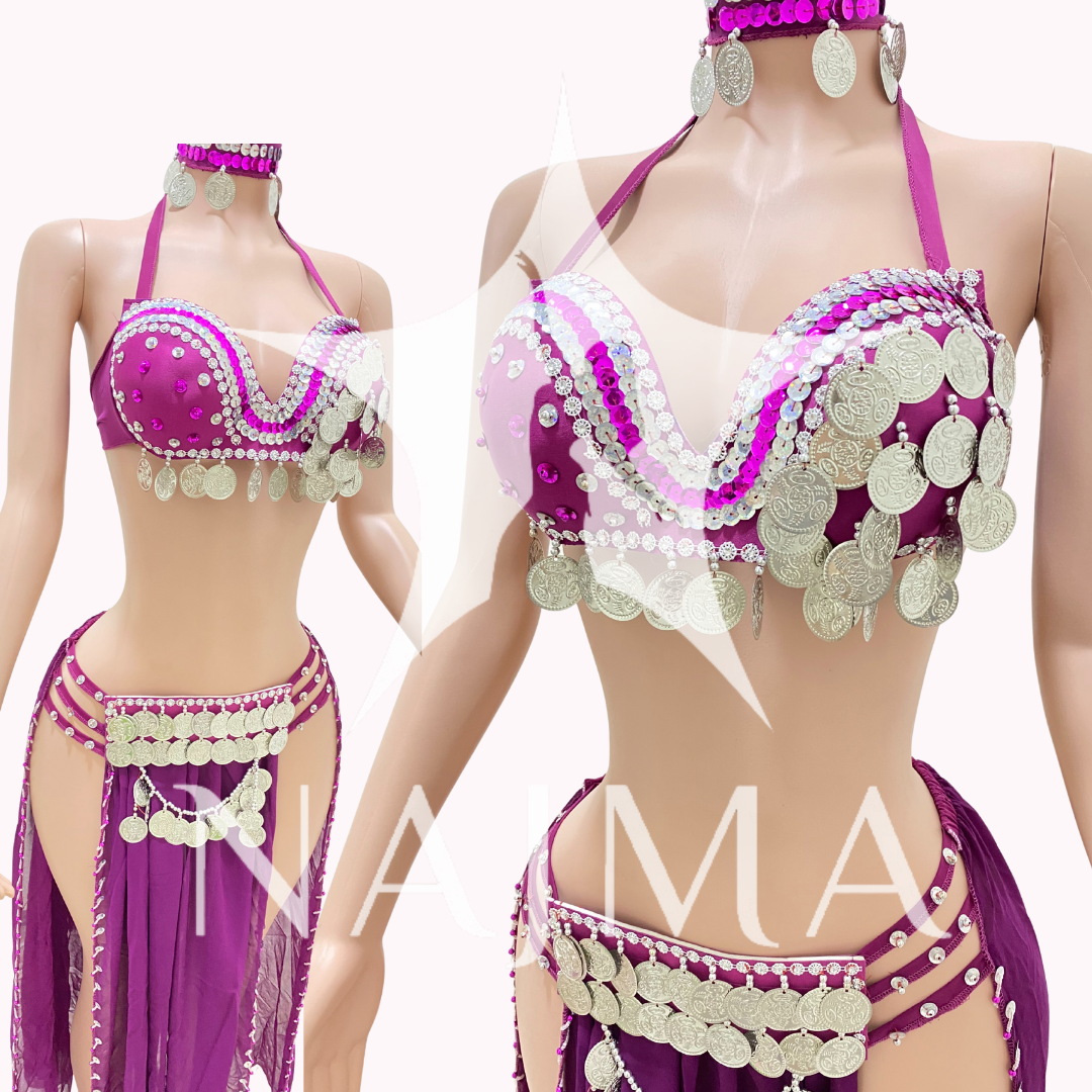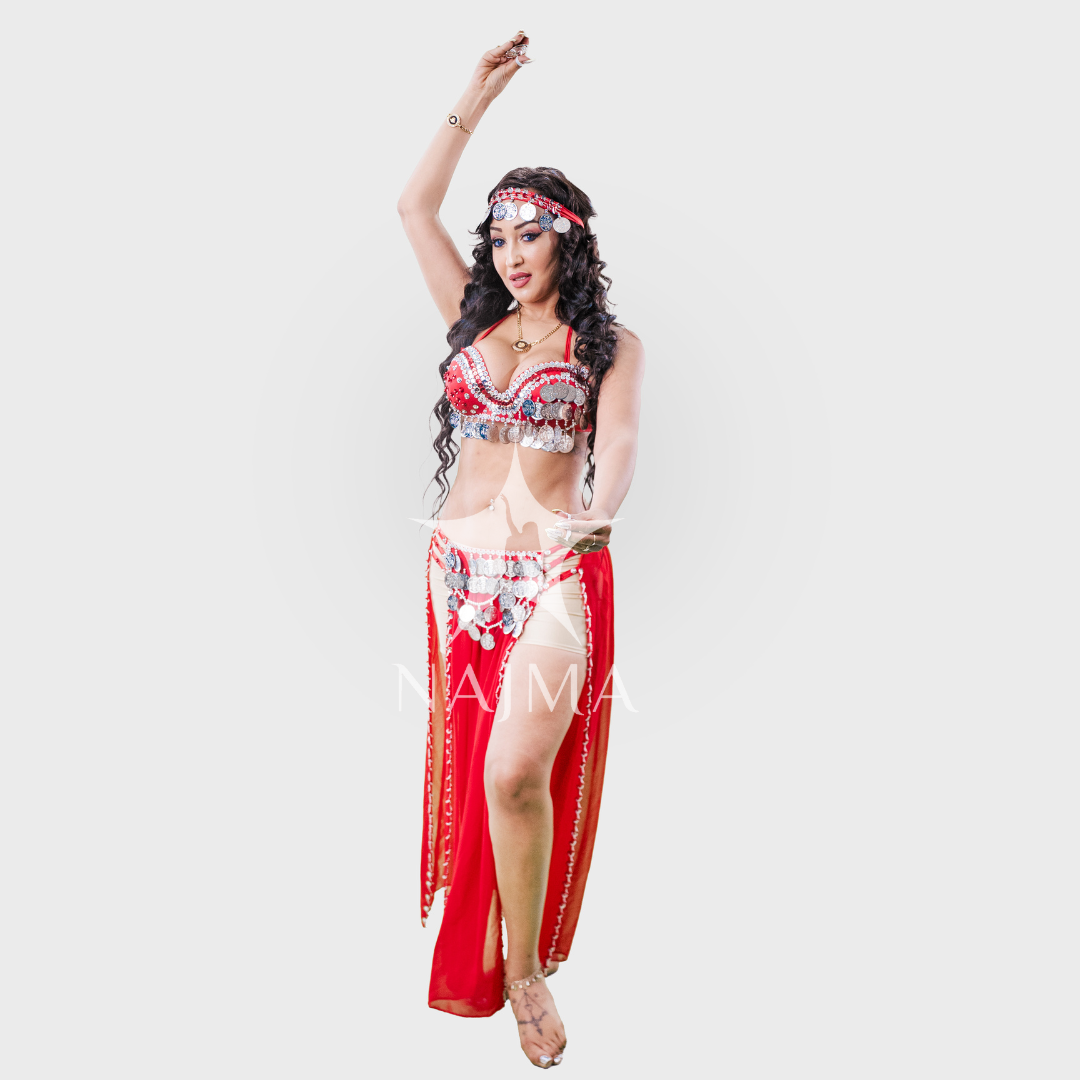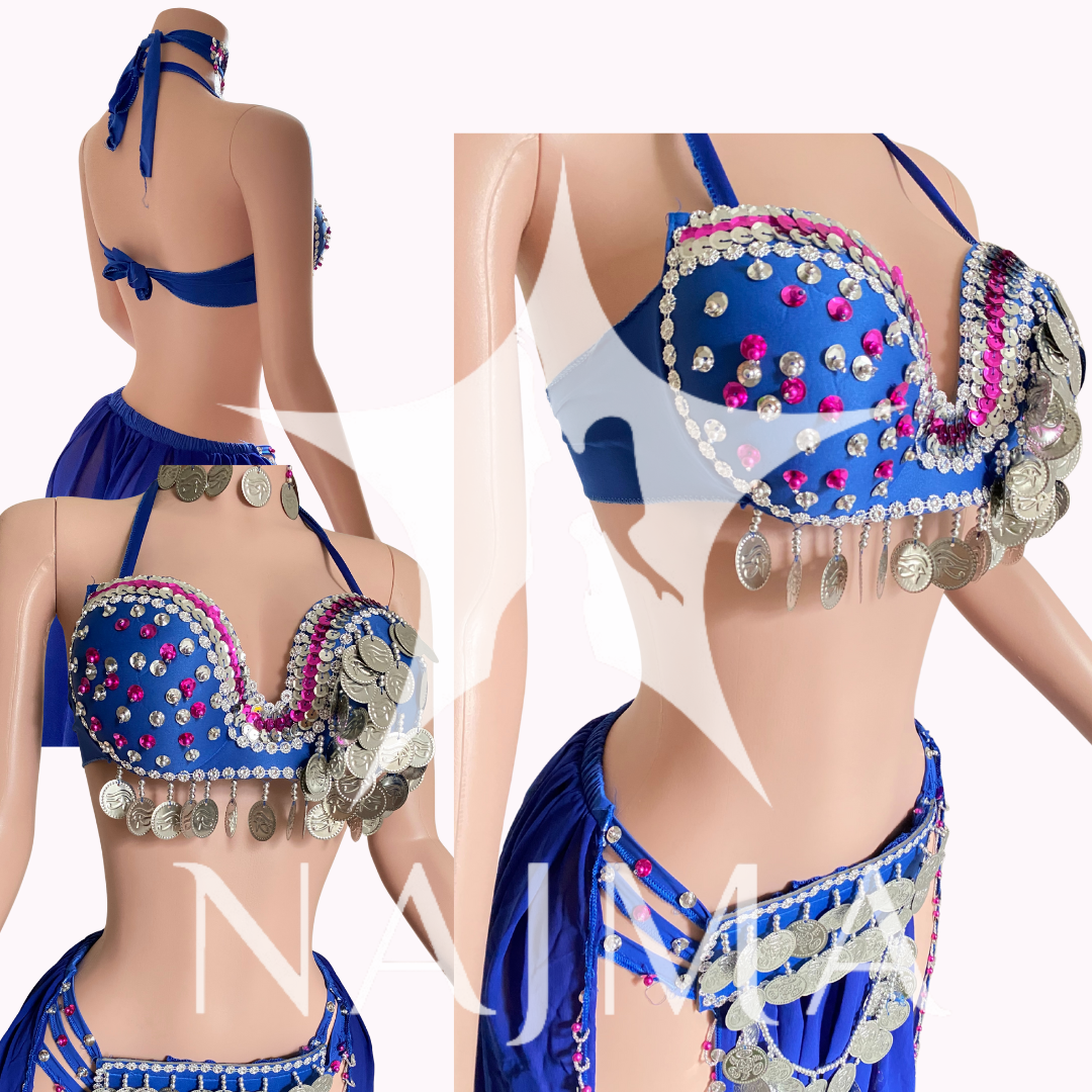 بدلة رقص اربعة قطع حمالة مع تنورة مع قطعة راس وصاجات فضية