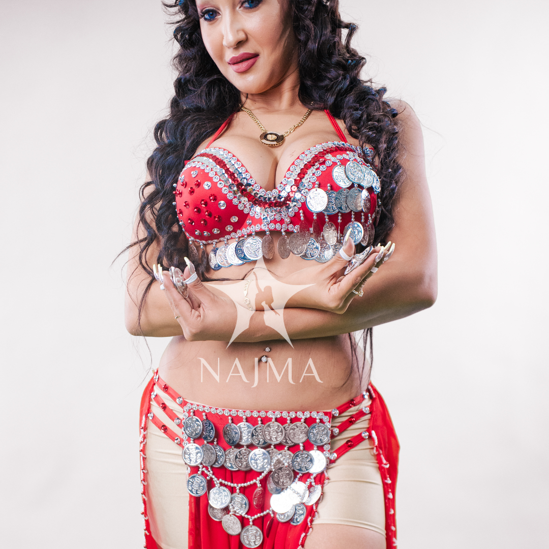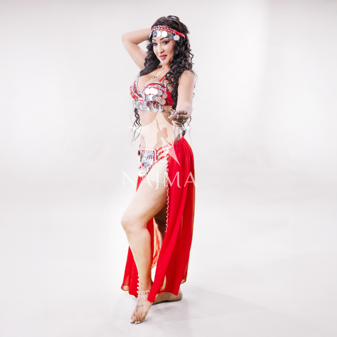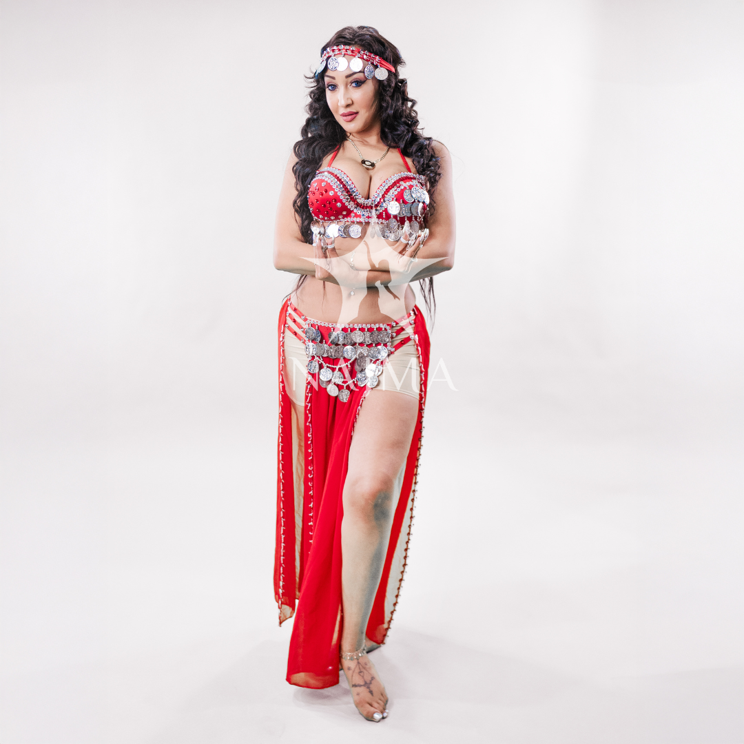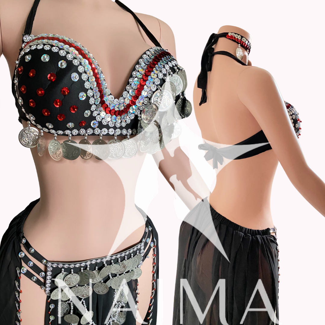 بدلة رقص اربعة قطع حمالة مع تنورة مع قطعة راس وصاجات فضية