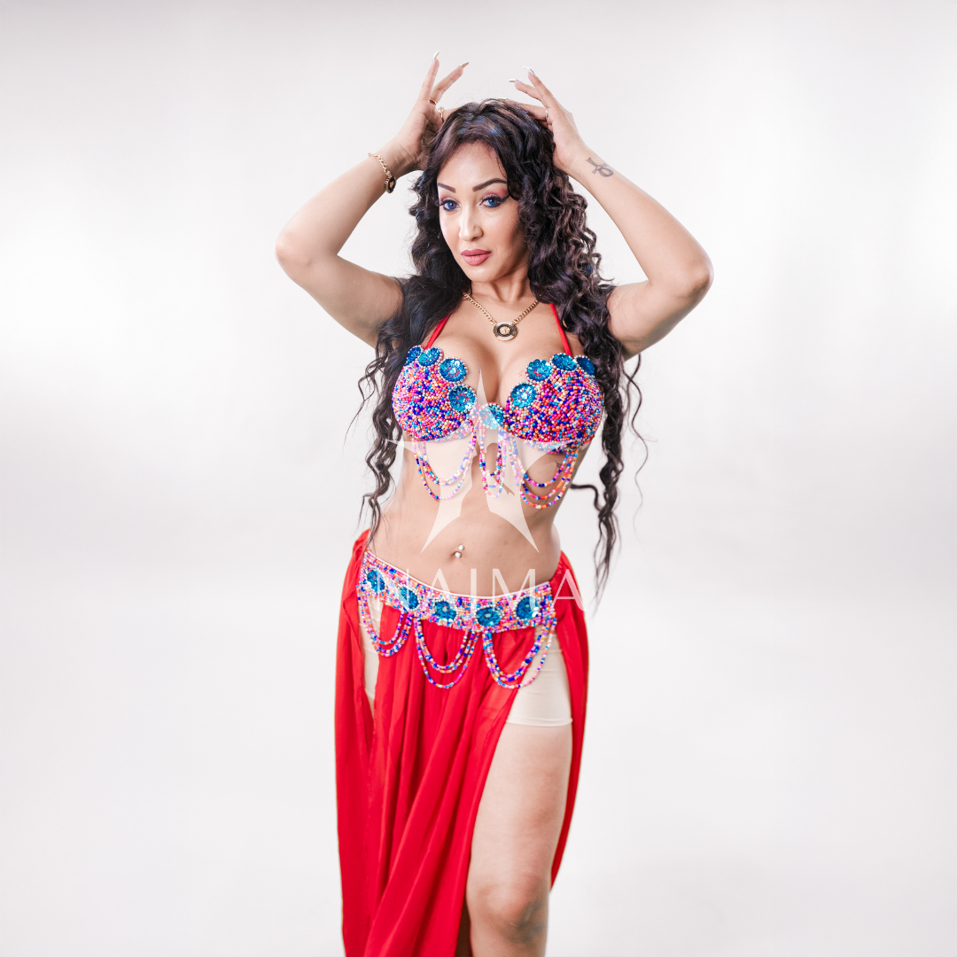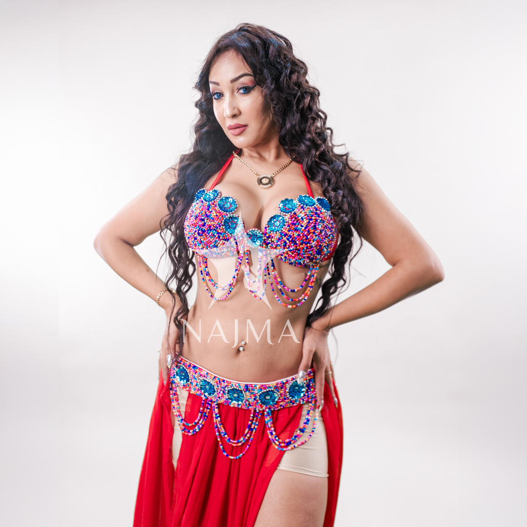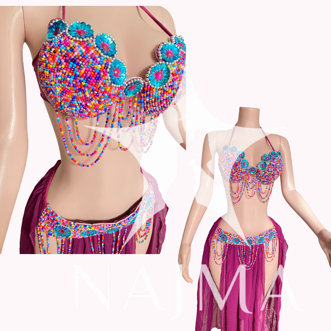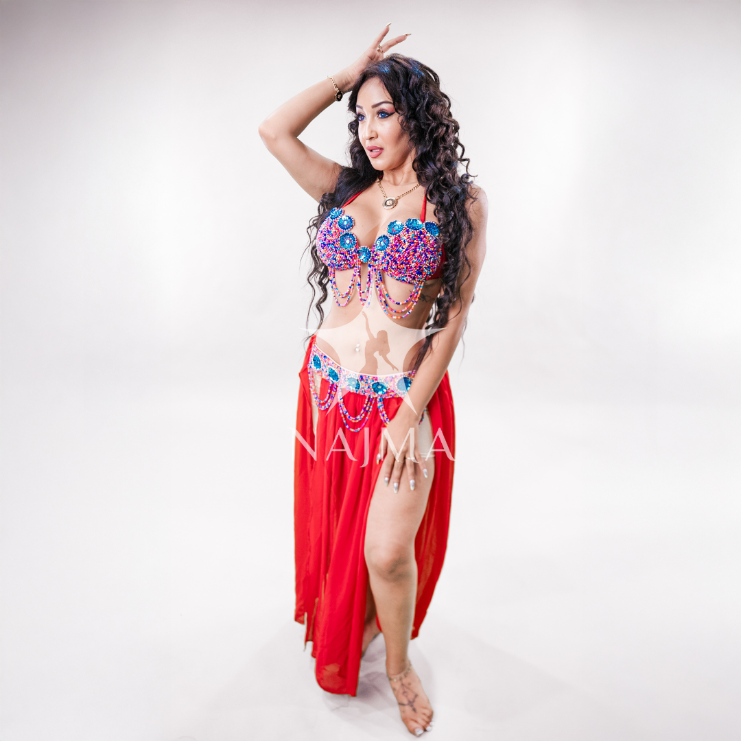 بدلة رقص حمالة مع تنورة وتراجي فضية متوفرة باللون الاحمر والاسود والبنفسجي