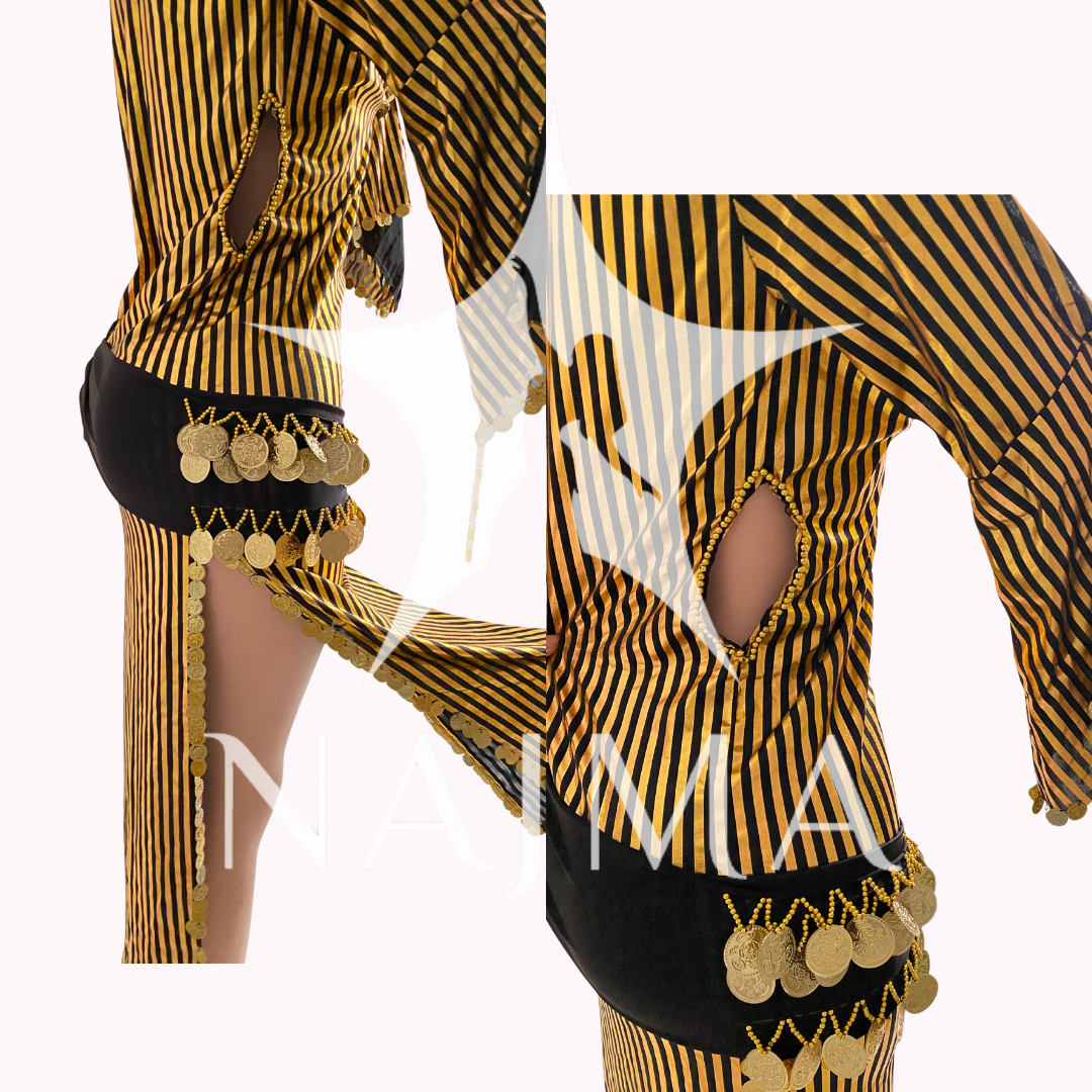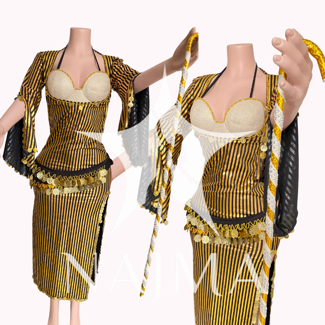 جلابية رقص صعيدي ذهبية مخططة مكونة من ثلاثة قطع الجلابية مع حمالة وحزام ومع قطعة رابعة عصا رقص ذهبية