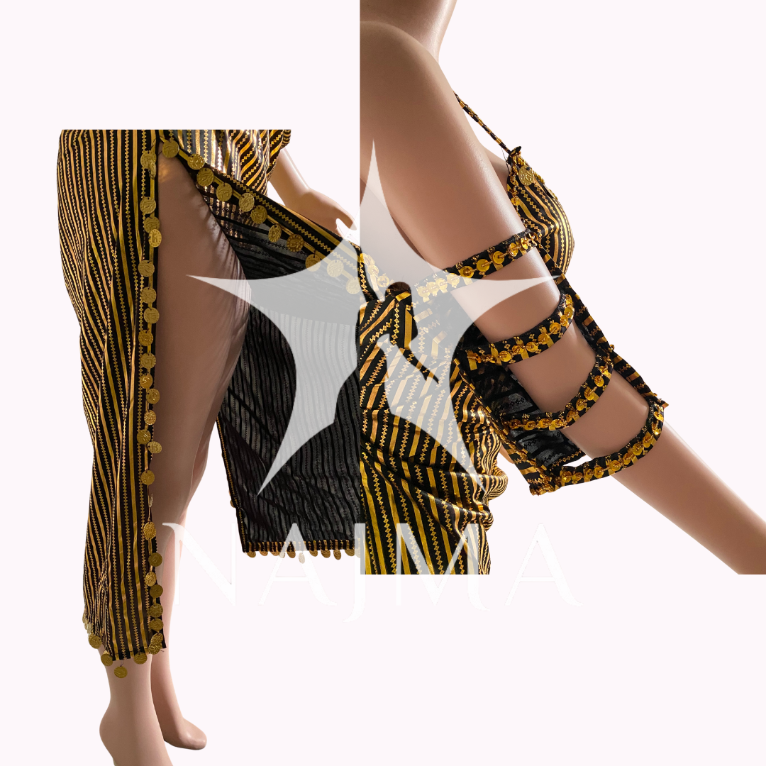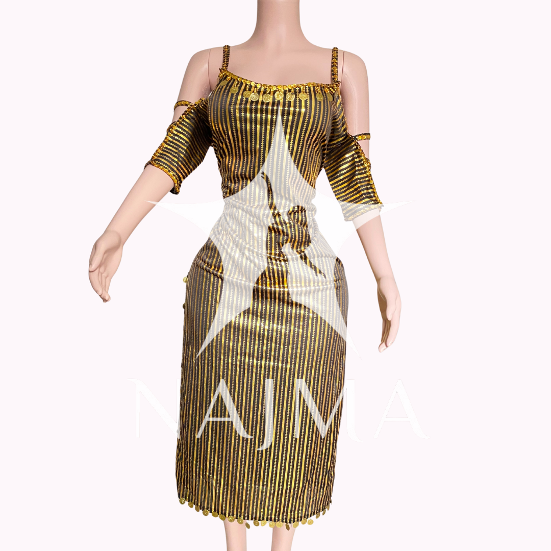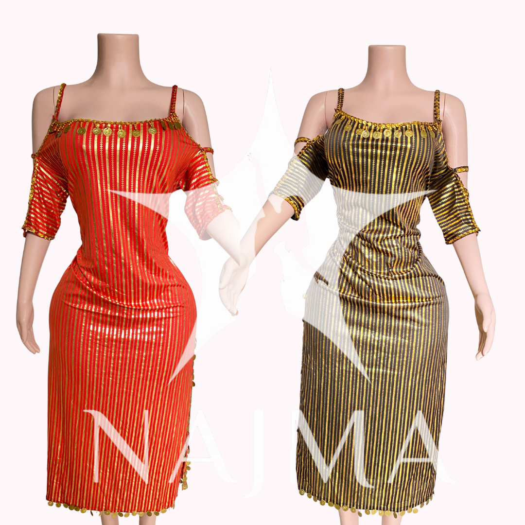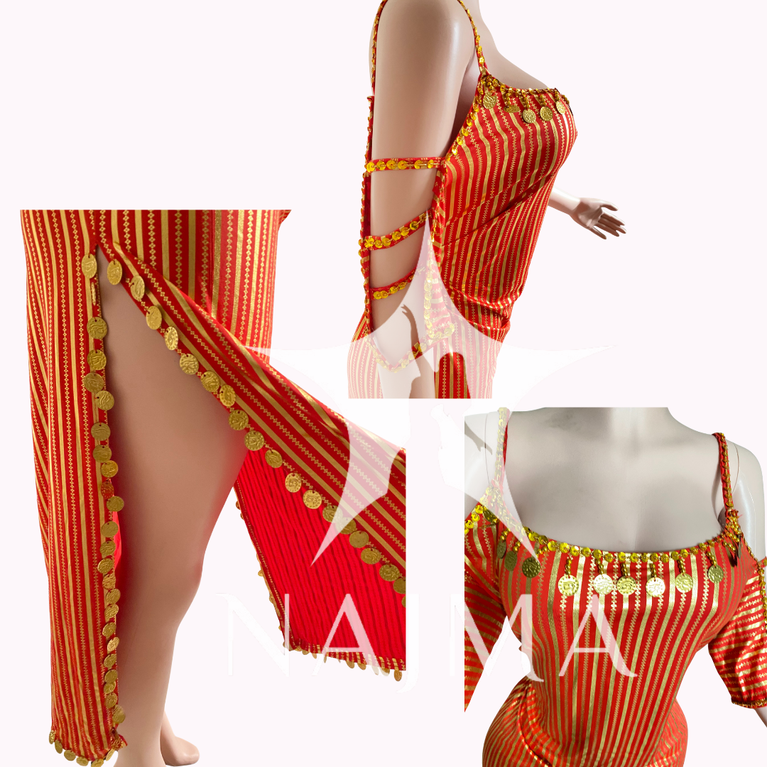 جلابية رقص قطعة واحدة مع ليرات معدنية في الفتحات الجانبية متوفرة باللون الاحمر والذهبي قياسات كبيرة تلبيس لحد وزن 120 كيلو