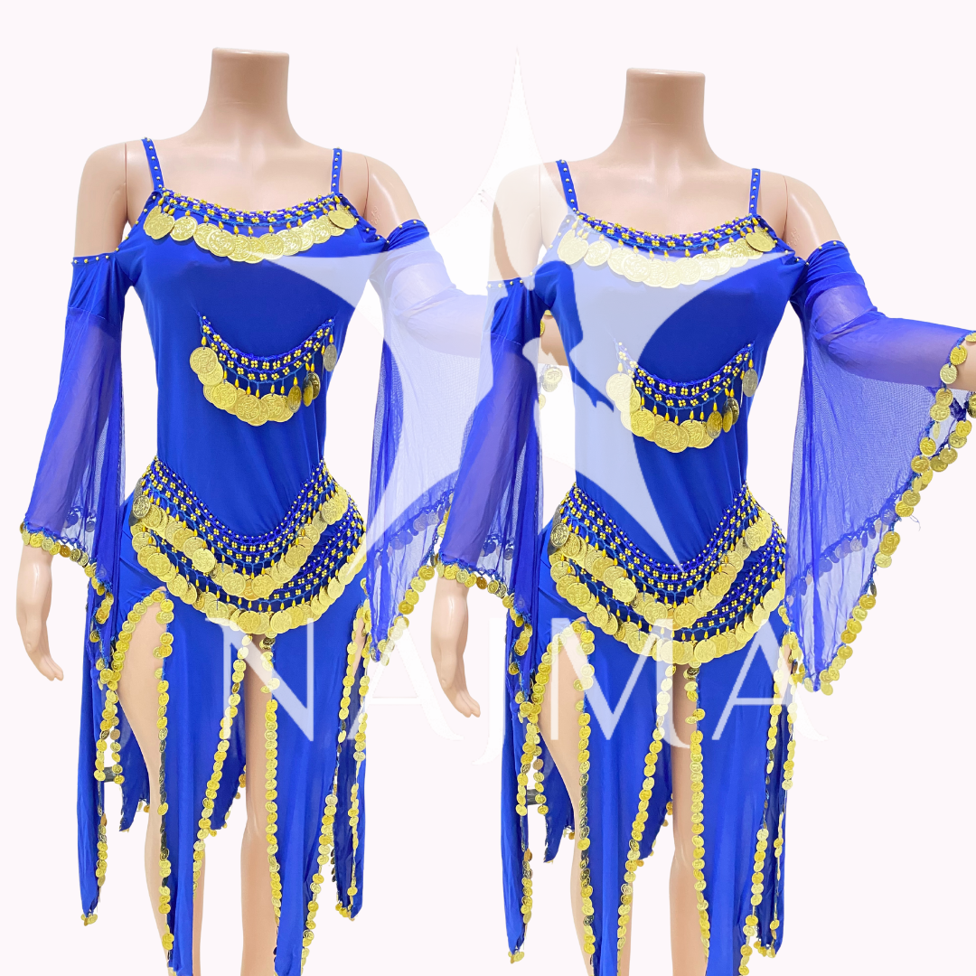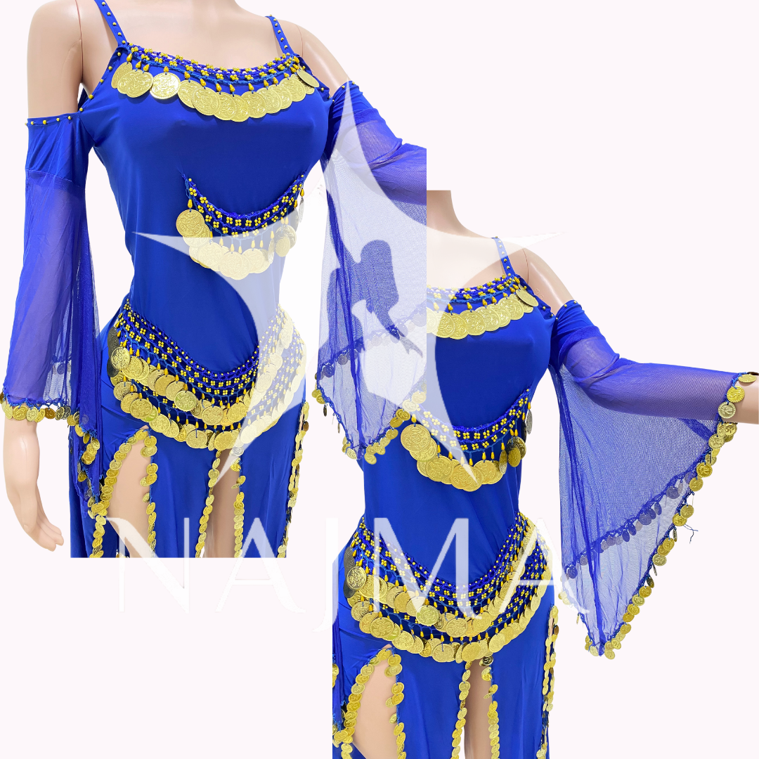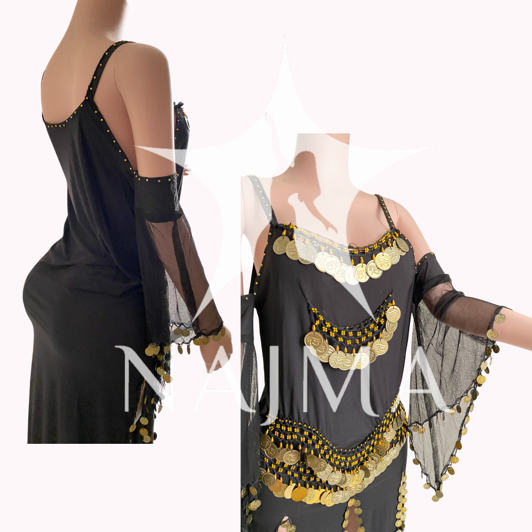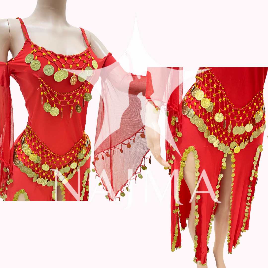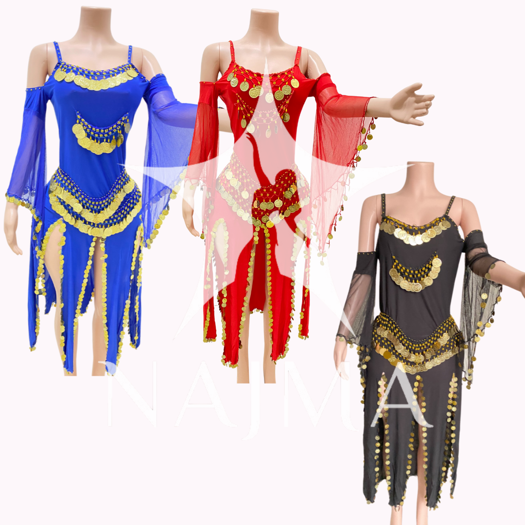 جلابية رقص ثقيلة مملؤة بالليرات المعدنية مع صاجات ذهبية متوفرة باللون الاحمر والاسود والازرق